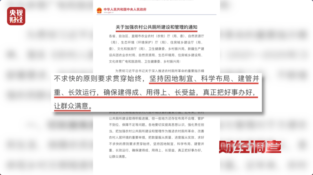 根据2022年8月,农业农村部等七部门联合印发的《关于加强农村公共厕所建设和管理的通知》中要求的“用得上、常受益”,如今却出现了“建而不用”的怪事。