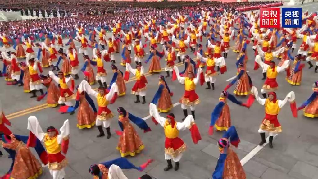 表演方队时而聚拢,时而散开,双手甩动长袖,动作优美,演员们在这欢快的舞步中挥洒着幸福。